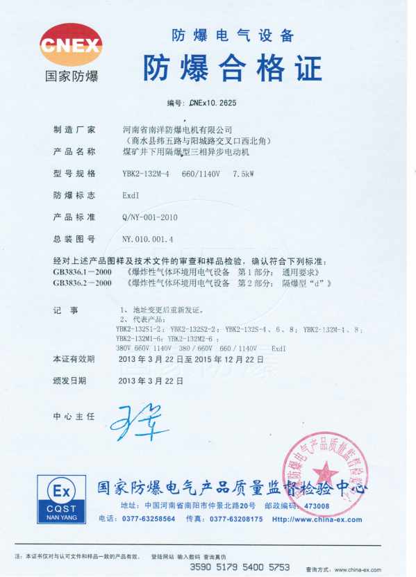 YBK2系列隔爆型三相异步电动机技术条件(机座号63-355)。标准号为JB/T9593.1-2001按照GB3836.1-2000《爆炸性气体环境使用电气设备 第1部分:通用要求》GB3836.2-2000 爆炸性气体环境用电器设备 第2部分:隔爆型:“d” 》的要求,制成隔爆型。防爆标志为EXDI。适用于含有甲烷或煤尘的煤矿井下固定设备,可燃性气体的场所内的设备上,作为一般动力设备使用。