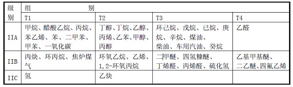 II 类 除煤矿外的其他爆炸性气体环境用电气设备。II 类爆炸性气体的特性进一步分类为:IIA、IIB、IIC。II 类常见可燃性气体、蒸气、温度组别见下表 II 类 用于除煤矿以外的爆炸性粉尘环境,III 类再分类:IIIA 类:可燃性飞絮 ; IIIB类:非导电性粉尘;IIIC 类:导电性粉尘;