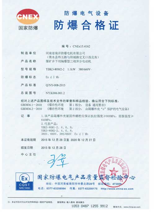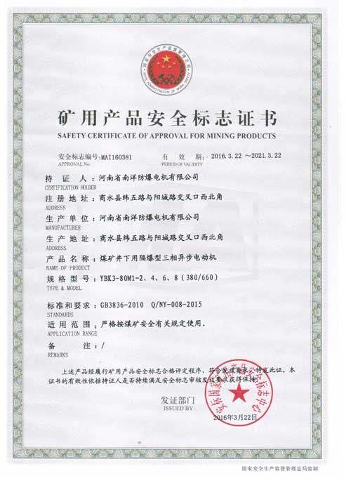 本系列电动机符合 GB755-2008《旋转电机定额和性能》、企业标准Q/320206JLAB88-2010《YBK3系列煤矿并下用隔爆砚三相异步电动机技术条件(机座号H100-355)》。其防爆性能符合BG3836.1-2010《爆炸性环境第1部分:设备通用要求》和GB3826.2-2010《爆炸性环境第2部分:由隔爆外壳"d"保护的设备》、也符合MT451一l995《煤矿用隔爆型低压三相异步电动机安全性 能通用技术规范》的规定,制成隔爆科ExdI适用于煤矿井下爆炸性气体环境的危险场所。也符合IEC79-1,BS4683和EN50018的规定,制成隔爆型。防爆标识为ExdI Mb,使用有爆炸性气体混合物存在的场所。ExdI Mb适用于煤矿采掘工作面具有甲烷或煤尘的爆炸性混合物存在的工作环境。