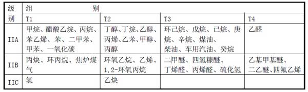 II 类 除煤矿外的其他爆炸性气体环境用电气设备。II 类爆炸性气体的特性进一步分类为:IIA、IIB、IIC。II 类常见可燃性气体、蒸气、温度组别见下表 II 类 用于除煤矿以外的爆炸性粉尘环境,III 类再分类:IIIA 类:可燃性飞絮 ; IIIB类:非导电性粉尘;IIIC 类:导电性粉尘;