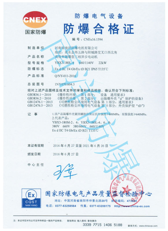 YBX3系列隔爆型粉尘防爆三相异步电动机(机座号63~355)(以下简称电动机),按照GB3836.1-2010《爆炸性环境 第1部分:设备 通用要求》和GB3836.2-2010《爆炸性环境 第2部分:由隔爆外壳“d”保护的设备》GB 3836.3-2010《爆炸性环境 第三部分:由增安型e保护的设备》的要求,制成隔爆型,防爆标志为:Ex tD B21 T135℃,可以覆盖Ex tD B22 T135℃、Ex tD A22 T135℃、Ex tD A21 T135℃,可以替代YFB系列DIP B21 TB,T4/DIP A21 TA,T4的粉尘防爆电机。适用于存在可燃性粉尘场所和可燃性飞絮的场所。粉尘防爆电机选型要结合电机使用场所的粉尘区域来选定。
