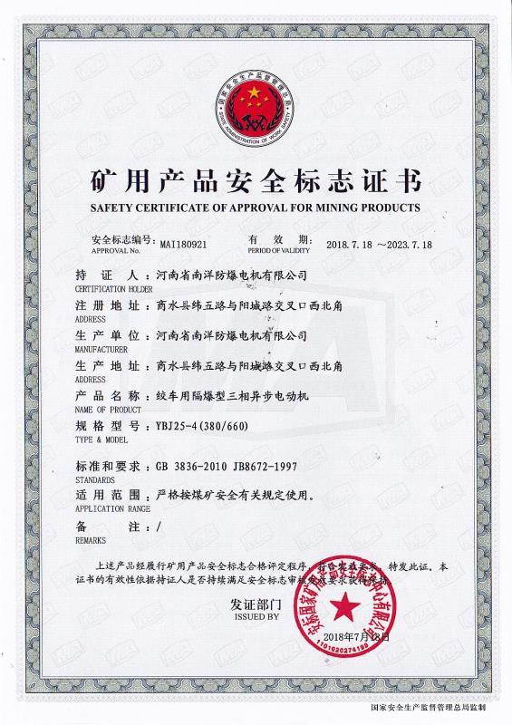 YBJ煤矿井下绞车用隔爆型三相异步电动机防爆合格证